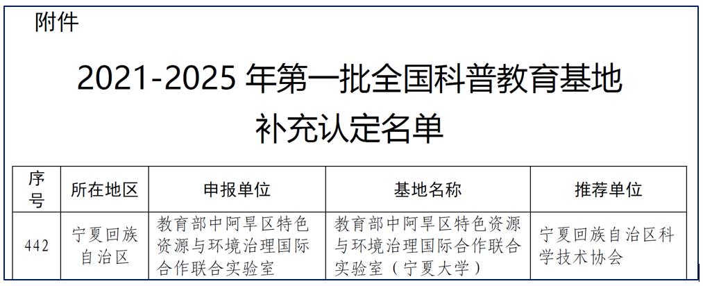 近日,中国科学技术协会办公厅公布《2021-2025年度第一批全国科普教育基地补充认定名单》,公司“教育部中阿旱区特色资源与环境治理国际合作联合实验室”入选首批全国科普教育基地。