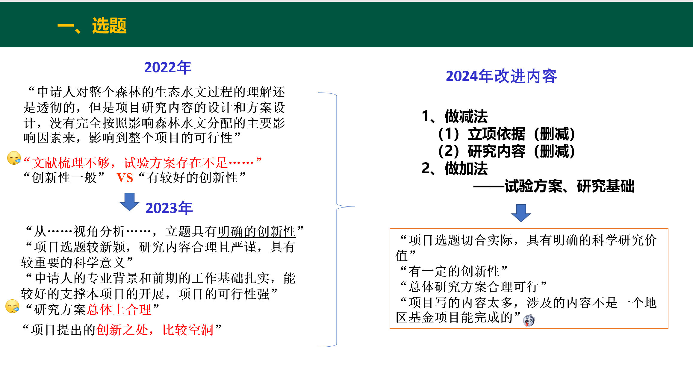韩磊研究员结合自己在基金评审过程中发现的问题,详细讲解了选题的重要性以及如何紧密围绕主题撰写高质量立项依据和研究方案。他强调,在基金申报书修改过程中,总结以往失败经验挖掘评审意见背后深意尤为重要。
