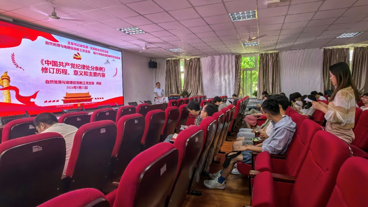 为准确把握党纪学习教育的目标要求,教育引导党员教师员工学纪、知纪、明纪、守纪,搞清楚党的纪律规矩是什么,弄明白能干什么、不能干什么,把遵规守纪刻印在心,内化为言行准则。5月22日,自然地理与地理信息教工党支部联合励行书院地理学研究生党支部,深入开展学习新修订的《中国共产党纪律处分条例》为主题的党日活动。自然地理与地理信息教工党支部书记何俊主持并作党纪学习教育专题辅导,30余名党员参加辅导报告。