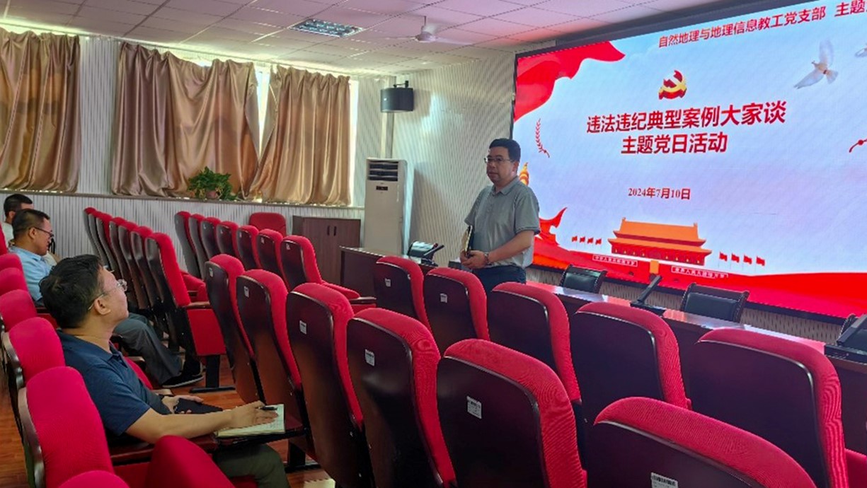 7月10日下午,自然地理与地理信息教工党支部组织全体教工党员开展“违法违纪典型案例大家谈”主题党日活动,通过具体案例剖析,增强党员教师的纪律意识和规矩意识。