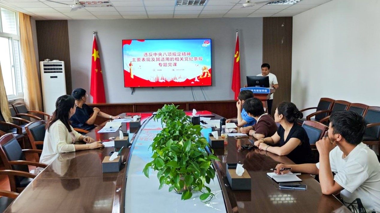为开展深入贯彻中央八项规定精神学习教育走深走实,引导广大党员教师时刻绷紧纪律之弦,筑牢思想防线,7月9日下午,地理科学与城乡规划教工党支部在德润楼305会议室开展以“镜鉴规定明戒尺肃纪纠弊倡新风”为主题的党日活动,公司党总支副书记、纪检委员李应海讲授“违反中央八项规定精神主要表现及其适用的相关党纪条规”专题党课。