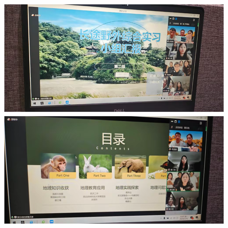 在线上实习总结汇报中,八个实习小组轮番上阵,总结汇报形式多样、内容丰富,展现出良好的团队协作能力。从宁夏到陕西再到四川,每一片土地都留下了同学们探索的足迹,既有对自然地理奇观的惊叹,对山川河流壮丽的赞叹,对地质构造奥秘的感叹;也有对人文与城市地理的洞察,对城市建设与可持续发展的探讨;更有将本次实习收获融入教育实践的奇思妙想,展现了地理专业的无限可能。