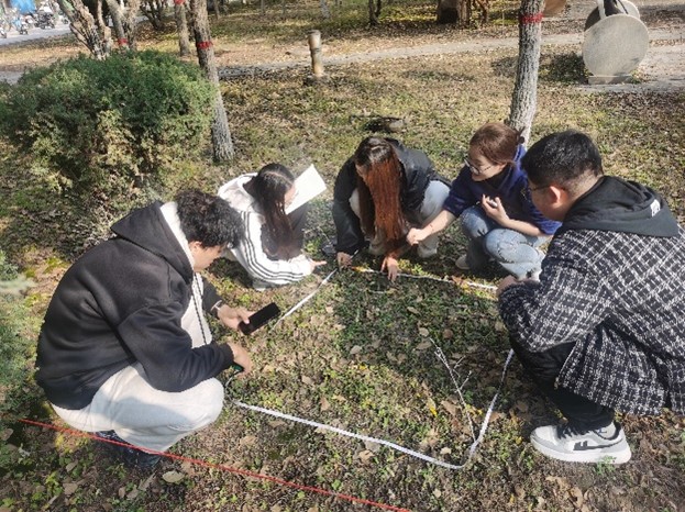 10月31日,何俊、李茜老师带着同学们在校园开展了以“调查植物组成 分析群落结构”为主题的课程实践。四个小组分别被安排在公司的三个校区,开展植物组成和群落结构调查实践。同学们分工明确、通力合作,呈现出一派忙碌而快乐的景象。各小组将课堂所学的植物调查等知识和课程实践紧密结合,顺利完成了样方设置、植物识别、数据调查、资料记录等工作。调查工作结束后,同学们利用晚上的时间,对采集的植物标本进行了压制。