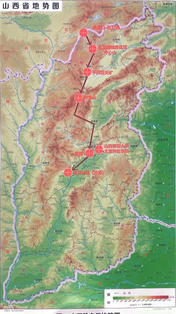 8月7日至8月11日,第十六届全国高校地理学联合野外实习队伍来到山西省,开始了为期5天的山西段实习。山西段线路横跨晋北、晋西北和晋中的“表里山河地、美丽几字湾”为特色,具体路线为:右玉-朔州-宁武-太原(如图1所示)。