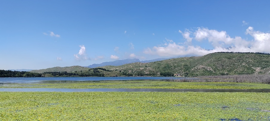 接着,来到了海拔1700余米的天池湖泊群,因其在年蒸发量高达1500毫米的条件下仍能维持稳定的淡水水体,引发了师生们的浓厚兴趣。山西师范大学王国强老师从地质构造角度入手,指出该湖群底部依托侏罗纪时期形成的紫红色砂岩层。这一岩层具有显著的隔水特性,有效阻断了地下水的大量渗漏,从而解释了湖泊“阳旱不涸、阴霖不溢”的特殊水文现象。与此同时,山西师范大学赵峰侠老师则引导同学们实地观察和辨识湖泊周边的挺水植物以及湖中的沉水植物。在两位老师的讲解中,同学们认识到,天池湖泊群之所以能在高蒸发环境下保持淡水稳定,既是隔水地质基底控制的“先天条件”,也是湿地生态系统自我调节的“后天机制”,体现了自然系统中文理交叉的综合性与复杂性。