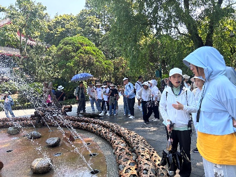 在对都江堰的自然条件、区位条件、人文意义进行介绍后,老师带领大家对都江堰的鱼嘴、飞沙堰、宝瓶口、堤、闸、离堆、笼重要水利景观逐一进行了参观、讲解。引导大家认真领会这一水利奇观的“巧妙”所在,理解这一水利壮举的伟大意义。