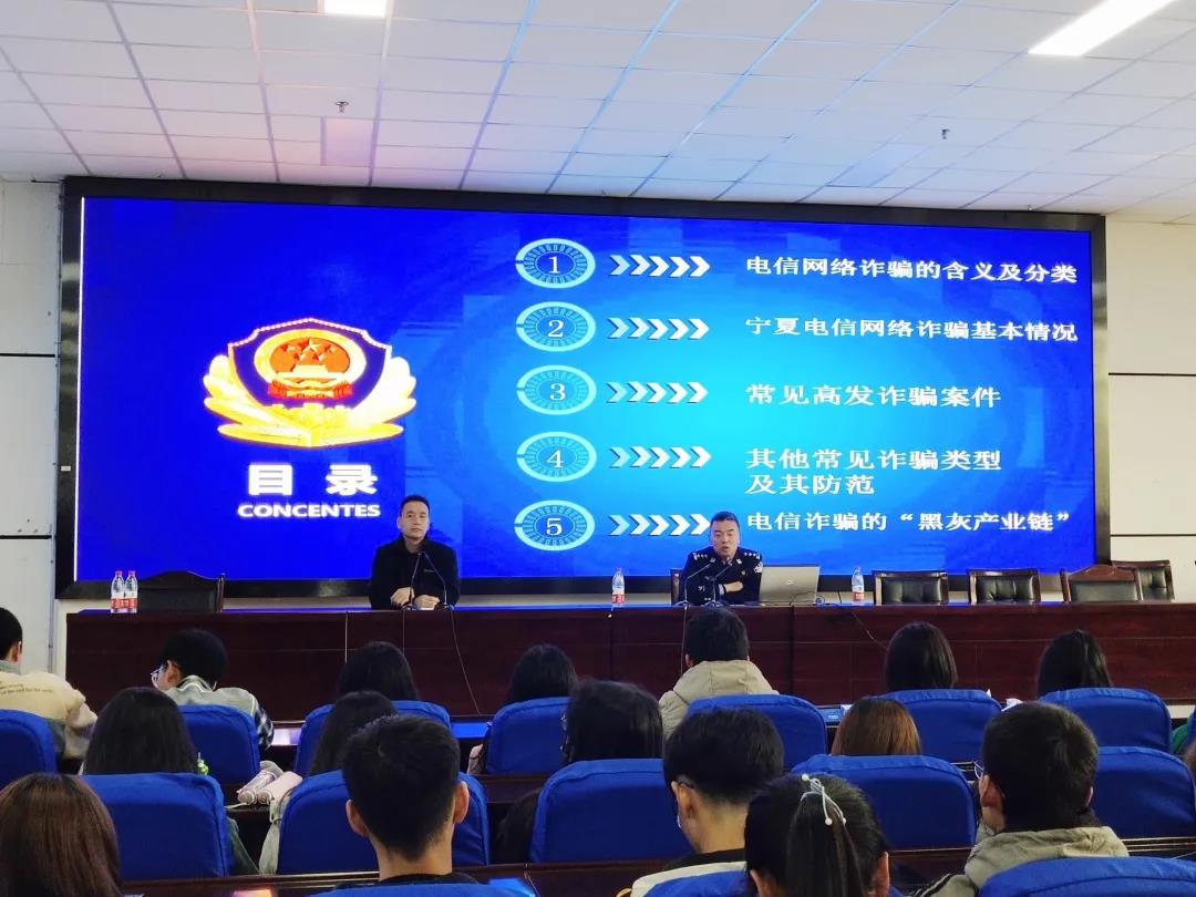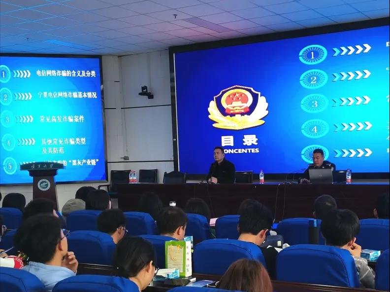 随着大数据时代的发展,电信网络诈骗引起社会的广泛关注。为增强老员工防范电信网络诈骗意识,普及网络安全知识以及强调电信诈骗危害性,宁夏公安厅刑侦总队宁夏反诈中心于2020年11月18日14:10在贺兰山校区文荟楼东报告厅开展以“防范电信网络诈骗”为主题的知识讲座。此次讲座特邀宁夏公安厅刑侦总队反电信网络诈骗中心一级警长杨顺担任主讲人,公司2020级地理科学(教师教育)班、2020级环境科学班共40人参加此次讲座。