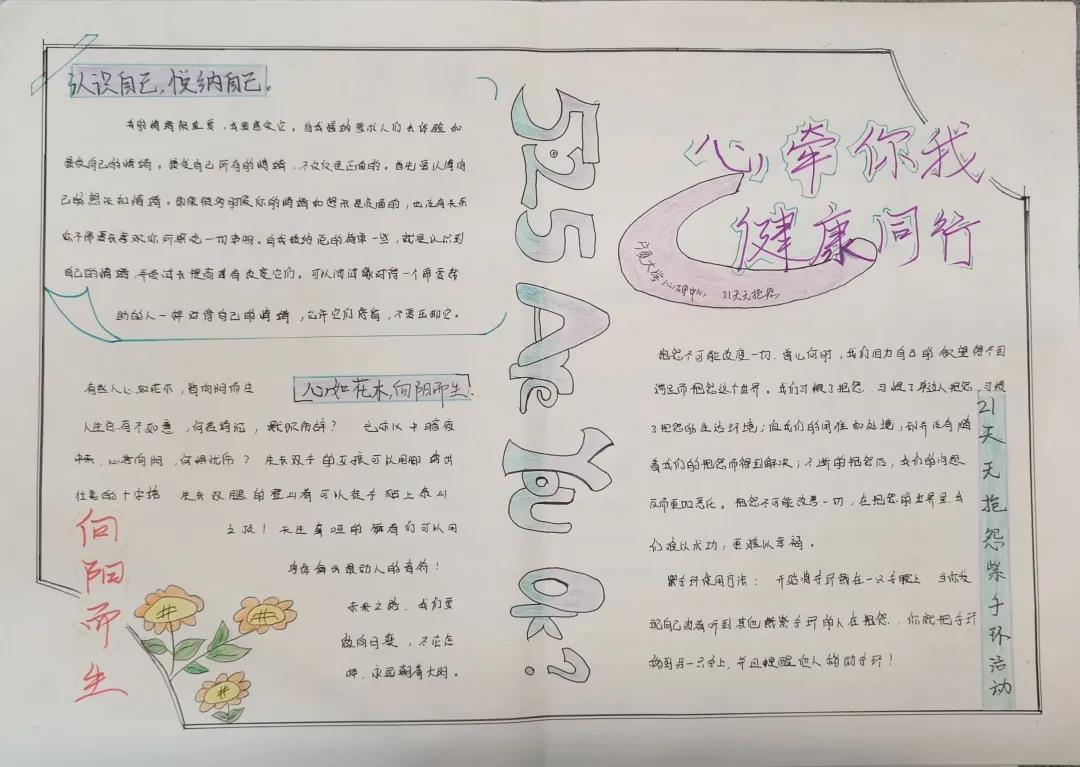 此次活动总共有两个内容:一是由公司组织员工在公司101教室观看《理想照耀中国》的电影,使员工在自我领悟、自我反省、自我提高中,达到自我教育的目的,同时帮助同学们树立维护心理健康的意识。此外,各班心理委员组织本班同学召开班会,并以手抄报的形式表达自己对心理健康的看法。同学们参加活动热情高涨,手抄报的画风各异,他们各自施展才能,在手抄报的样式及色彩搭配上各显神通,不仅如此,在文字版面的心理小知识也同样别出心裁。