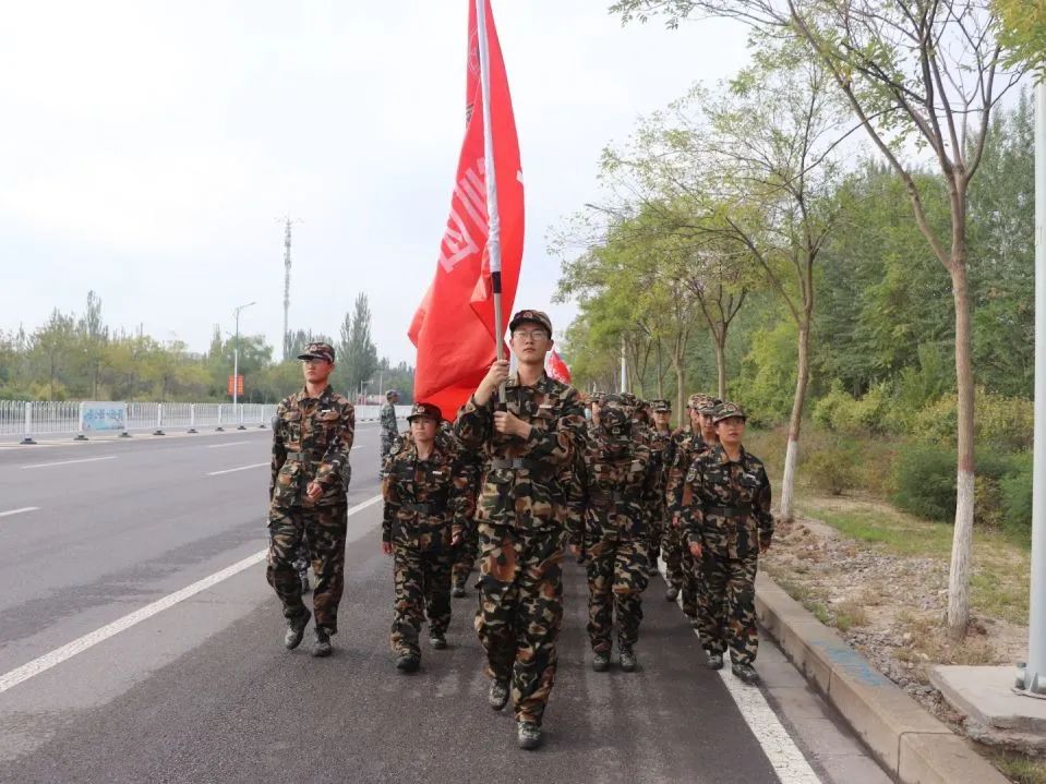 公司营队以战旗开路。拉练途中,整齐有序、齐步共进,先后进行了防空袭演练、口令传递、穿越染毒地带的军事演练。面对重重考验的“小战士们”在各种模拟训练中临危不乱、冷静应对,他们在警报声中奔跑,在烟雾中突围。在军训拉练中,他们充分展现出了地规学子朝气蓬勃、奋发向上的精神面貌。“巍巍贺兰,蜿蜒六盘,二营三连,坚毅如山”,在高昂热情的口号声中,二营三连的队伍始终向前。